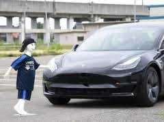 従業員は試乗車に乗り、別の車の後部を写した実物大パネルに向かって進んでいたが、